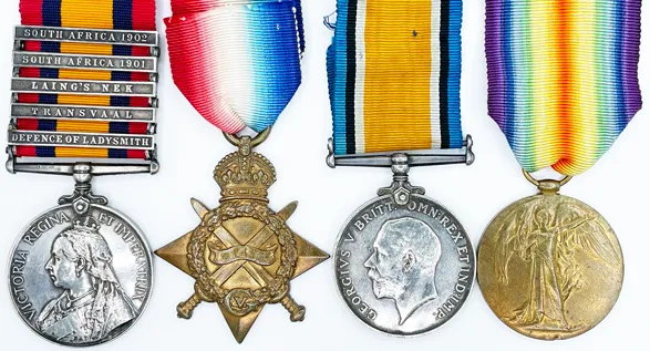 A Boer War and Great War group of four awarded to Driver J. P. Higgins, Royal Canadian Field Artillery, late Liverpool Regiment who was severely wounded at the action on Geluk Farm on 23 August 1900 where Private W. Heaton won his Victoria Cross: Higgins was to be invalided out on 1 March 1901